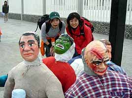 政治家や有名人の人形を作ることも多い。実際、12月30日くらいから、街中でこの人形を売ってた。ブッシュ、フセイン、ビンラディン、グティエレス(エクアドルの大統領)等々。今年はマイケル・ジャクソンもいただろうな、きっと。ただ、普通の人は自分の身近な人の誰かに似せて作る。日本人的な感覚だと、自分の人形が作られて、それが焼かれちゃうとなると抵抗あるけど、こっちの人は別に平気らしい