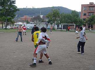 チーム分けして、メンバーが分かるようにこっちのチームは全員上半身裸に。エクアドル人の年齢は、20歳前後から30歳前後まで色々な年齢層がいたね。でイギリス人は20代前半かな。始めはこの2500mの高地で俺の心肺系がもつのか心配だったけど、結構普通に走れたよ。これも駒ヶ根訓練所で毎日サッカーをやってたおかげかな。(ただ、今だに旧市街へ通じる階段を上るだけで息が切れるんだけど・・・。)