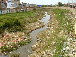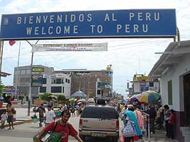 バスを降り、ペルーとの国境の街ウアキージャス(Huaquillas)行きのバスが出るバスターミナルへ。クエンカからのバスが到着したターミナルから歩いて10分くらい。そこでもすぐにウアキージャス行きのバスは出発した。途中サンタ・ロサを通り過ぎ、国境近くなると検問所を経て(ここでは全員がバスを降りてIDを提示しなければならない)、2時間弱でウアキージャスに到着。昼食後、ペルーとの国境へ向かって歩く。メルカード(市場)の先にある国境は、ただのドブ川だった。ドブ川にかかる橋の周辺には、たくさんの露店が出て人々でにぎわっている。「ようこそペルーへ」という巨大な看板がある。そこに国境事務所らしきものはあるにはあるが、誰もパスポートの提示などしていない。そう、みんな平気で普通の道を歩くように国境を行き来しているのだ!こんな国境は初めてだ。こんなんでいいの?