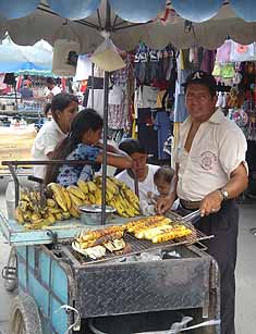 国境付近では、道の両側に果物や衣類やCD等を売る露店がびっしりと並んでいる。そこでは俺に日本語で話しかけてくる奴、「日本語で自分の名前を書いてくれ」って言ってくる奴らにさかんに声をかけられる(奴らが紙にスペイン語で自分の名前を書くから、俺はそれをカタカナにしてその下に書いてやった)。