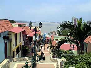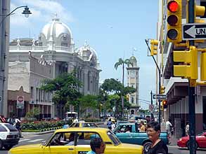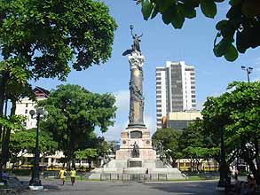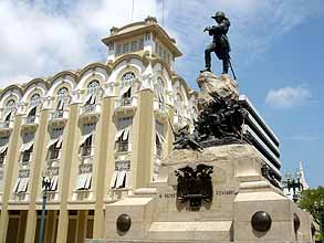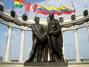 8月10日通りと並ぶもう一つのメインストリート10月9日通りをグアヤス川まで戻る。ラテンアメリカ独立闘争の英雄、シモン・ボリーバルとサン・マルティンの銅像”La Rotonda”(ラ・ロトンダ)が目を引く。1822年、ボリーバルとマルティンがここグアヤキルで独立戦争の今後の方向性について会談した。南米独立史の一つのターニングポイントとなった、独立の指導者二人による密談が行われたのがここグアヤキルである。ボリーバルはベネズエラ出身で、スペイン植民地政府との戦いで北からベネズエラ、コロンビアを解放しながら南下して来、一方のマルティンはアルゼンチン出身で南からチリ、ボリビア、ペルーを解放しながら北上し、二人はエクアドルのグアヤキルで落ち合ったわけである。そして1830年、エクアドルも独立することになる。この二人は、南米解放の父として、”El Libertador”(リベルタドール:解放者)と呼ばれる。余談になるが、南米のサッカークラブチームNo1を決めるリベルタドーレス杯というのは、この「解放者」から来ている。「解放者杯」だ。