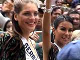 ミスたちは、自分の国の名前が書かれたたすきを肩からかけて、熱狂する群集に手を振りながら愛想を振りまく。全員歩きだ。