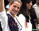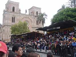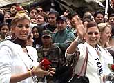 トリを飾ったのは、2003年のミスユニバース(ドミニカ共和国)。彼女はオープンカーに乗って手を振りながら、ひときわ高くなった群集の歓声に応える。彼女は1年間ミスユニバースの仕事をしてきてるので、さすがにこういう場に慣れているようで、人々への愛想の振りまき方が堂に入っている。彼女はエクアドルと同じスペイン語圏のドミニカ共和国出身なので、テレビにもよく出ていて、エクアドル人達に人気は高いようだ。
