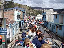 おっと、乗客の一人がゴミを屋根から投げ捨てました。白人系の観光客がほとんどですが、中にはエクアドル人も乗り込んでるようです。この行為を見れば、一目でこの乗客がエクアドル人であることが分かります。彼は、この後何度も何度もゴミを投げ捨てました。ってお前よ、ゴミ捨てんじゃネェよ!