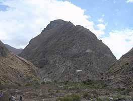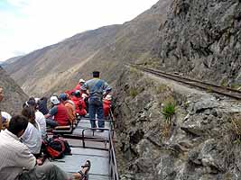 アラウシを出た列車は、すぐにゴツゴツした岩山の荒々しい風景の中に入っていきます。片側の線路の下を見ると、急な崖。谷底には小さな川が流れています。そして、この急斜面をスイッチバックで渓流の谷底へ降りていきます。2度のスイッチバックを繰り返した後しばらくして、列車は谷底に着きました。そこからは、悪魔の鼻(ナリス・デル・ディアブロ)と呼ばれる山を見上げることが出来ます。「悪魔の鼻」と言うからには、世にも恐ろしい形をした山なんだろうと、みなさんお思いでしょう。もちろんそう・・・、あれ?ナンだよこれ、ただの山じゃねぇか!!一体どういうネーミングしてんだよ?