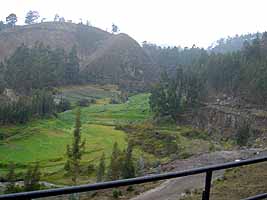 小雨が降るリオバンバの鉄道駅を朝7時定刻に発車した列車は、市街地を抜けすぐに畑と山々を見渡すのんびりとした風景に入っていきます。列車のスピードは時速30kmくらいでしょうか。