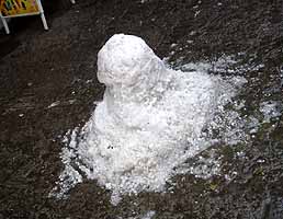ある店の軒先では、ひょうで小さな雪だるまもどきが作られていた(右下写真)。その写真を撮ると、店にいた若者達が親指を立てて、「グー!」のポーズ。彼らがこれを作ったらしい。