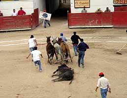 死んだ牛を数頭のラバたちが綱で引いて、砂地に死体牛の轍を作りながらリングの外へ運んでいく。きっとすぐに解体して、みんなで焼肉でもして食べるんだろう。