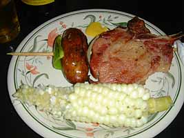 程なくして串焼きがやって来た。デカくて分厚い肉、ソーセージ、芋、タマネギ、ピーマンが刺さっている。そしてトウモロコシの焼いたのが付く。豪快に串に刺して火であぶっているイメージから、肉は硬いのかな〜という先入観があったが、食べてみてびっくり。柔らかくてジューシー、味付けも抜群なのである。物の本質はその見かけによらないとはまさにこのことである。