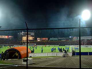 チケットは20ドル。試合開始は遅く、夜の9時。1時間ほど前にスタジアムに入ったが、もう既に満員。赤い発炎筒が焚かれ、煙がフィールド上を流れている。サイドライン側の席は赤いユニフォームを着たクエンカサポーターで一杯で、かろうじてゴール裏の一角が空いているだけだった。やむなくそこに陣取り、早速ウィスキーの水割りを始める。入り口での荷物検査で、警察の奴らに大将が買ったバドワイザー1ダースを丸々没収されてしまったのだが、ウィスキーにまでは目が届かなかったらしく、生き延びたのである。普段の試合ならビールとかシュミールを売り子が売っているのであるが、今日はアルゼンチンからボカ・ジュニアーズを迎えての国際試合なので、トラブルを考慮してアルコール一切禁止にした模様である。そんなわけで観客は少なくとも俺たちの周りでは酒を飲んで気勢をあげている奴はいない。ゴール裏の見にくい所ということで、熱狂的なファンも少ないようだ。