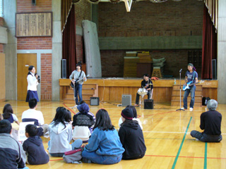 子供たちは、「楽器を弾かせて!」と俺のギター、モロちゃんのベースを、ステージの上でアンプを通してかき鳴らす。みんな生まれて初めて弾いたようだ。始めはちょっと恥ずかしそうにはにかんでいた子供たちの顔が、どんどん生き生きしてくる。音楽の持つ力だ。俺の同期の養護隊員の池田篤は、知的障害者相手に、ギターをかき鳴らして授業をするという音楽療法を実践している。人類誕生のあけぼのから、ある意味音楽は本能に直結してきたものだったんじゃないかという気がしてくる。
