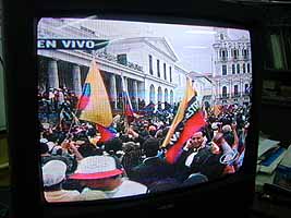 今日の午後延々と続くこのニュース、つまりはキト市内からの中継映像は、見ている方としては非常に面白かった。自分も戦場カメラマンとして戦場と化したキトで取材したかったくらいである。