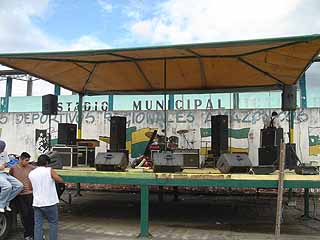 その後、リハーサルのため早速会場へ。会場は、県営スタジアム横のだだっ広い駐車場だ。そこに続く道路まで使って立錐の余地も与えなければ、1万人は収容できるだろう。まだ開始3時間も前なので、もちろん観客は誰もいないが、今晩はここが人波で埋め尽くされ、その人の絨毯の上をギターを弾きながら仰向けに遊泳している俺自身の姿をそっと頭に思い浮かべる。と同時に、ここはプーヨセントロからは少しはなれたところにあって交通の便も悪そうなので、ひょっとしたら誰も来んかもしれんな、という不吉な思いもチラッとかすめる。