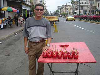 さて、10分もかからずに車はケベドのセントロの目抜き通りに着いた。休みだけあってかなりの人出だ。いつものようにビデオカメラを右手に歩き始める。このケベドという街は、人口10万、エクアドルでも有数の治安の悪い街だと聞いているが、俺にはそんなことは参考情報にしかならない。「いつでもどこでも撮る」、これが俺のポリシーであって、今までどこの国に行ってもこれを貫いてきた。今まで幸いにも銃やナイフで脅されたり、大人数で囲まれて強盗されたことは一度もない。世の中そんなに悪い奴らばかりじゃないからか、俺が怖いからか(笑)、単に運が良かっただけなのか。