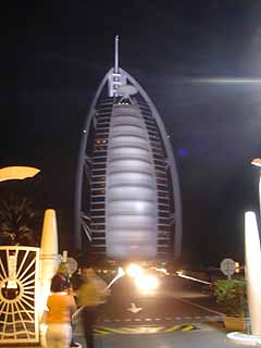 この2つの超豪華ホテルを冷やかしに指をくわえて眺めた後、再び市内へ向かう。もうすっかり夜。午後7時。待っても待ってもバスが来ない。バス停には僕と同じようにバスを待つ人々。ある人たちは全く意に介さずにおしゃべりをし、またある人は僕と同じように右往左往しながら来ないバスにイライラを募らせる。ここで僕はマイアミから来たという、USA Today(アメリカ合衆国の全国紙)の記者と名乗るアメリカ人と親しく話した。今の時期のドバイは気候的に過ごしやすいが、3月から11月までが夏で、真夏の最高気温は50℃にもなり、地獄の暑さだそう。彼は仕事で日本にも行ったことがあるそうだ。僕が持っていたデジカメを見て、「デジカメはどのメーカのものが一番いいか?」と聞いてきたので、一通り一般論をかました後、「人それぞれだから、分からない」と答える。