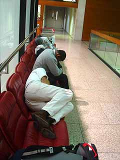 僕はねぐらを探して空港内を歩き回った。めぼしい場所はもうすでに占領され、先客が眠りこけている。エスカレータで上に上がると穴場があった。いすが並んでいて、肘掛もないので長く横になって寝れそうだ。近くにはおじさん一人。僕はここでデイパックを枕代わりにして横になった。しばらくウトウトして目を覚ますと、いつの間にか僕の脚の先の椅子にさらに四人が横になったりうなだれたりしながら寝ていた(左写真)。椅子は硬いプラスチック製ではなくクッションつきだったのでタダ寝にしてはなかなか快適に眠れた。