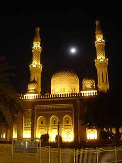 メルカートから、ドバイで最も美しいと言われるモスク、ジュメイラ・モスクまで歩く。闇の中にライトアップされたモスクは幻想的な美しさ。