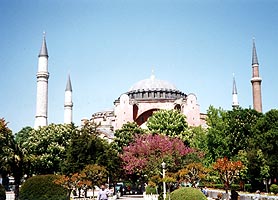 1435年、オスマントルコ帝国によりコンスタンティノープルが陥落すると、スルタンアフメット2世により、イスラム教寺院に変えられた。トルコの歴史を体現する建築物。