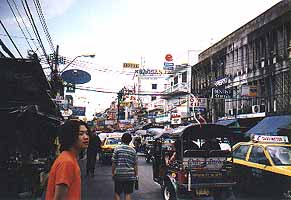 | KHAOSAN ROAD カオサン通り 世界中のバックパッカーが集まるカオサン通り。 安宿がびっしりと立ち並ぶ。 |