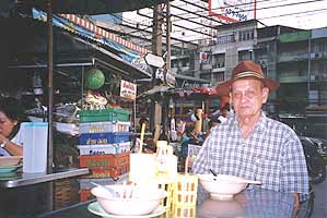 バンコクの屋台 東南アジアといえばやはり屋台。バンコクの屋台で美味しい麺(ライスヌードル)を食べた。メニューも、タイ語も分からないので、人が食べているのを指差し、「あれと同じ物ください。」 相席で対面に座った老人は、食べ方(テーブル上の様々な調味料の使い方)を教えてくれた。彼は食べ終わると、「ムエタイ見に行かないのか?」と私に聞いてきた。「これから行くところです。」と答えると、笑顔で去っていった。 |