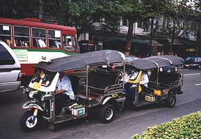| トゥクトゥク タイでおなじみの乗り物。3輪バイクタクシー。このドライバー達との値段交渉は骨が折れる。それに、運転が荒い。 |