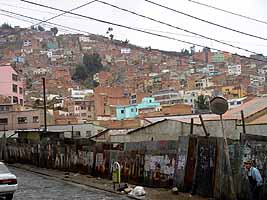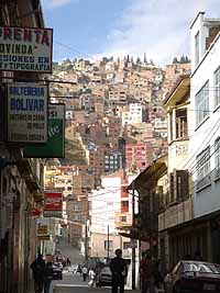 ラパスの街は、アンデスの山々の斜面とそれらに囲まれた中にあるすり鉢状の底に形成されている。山の斜面には茶色いレンガで出来た小さな貧しい家々が、山の頂上までびっしりと建っている。そしてすり鉢の底にメインストリートである7月16日通りが走り、その南東側は、山の上とはかけ離れた高級住宅街、官庁街となっている。