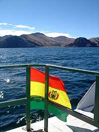 朝日を浴びた湖面がキラキラと輝く。船に取り付けられたボリビア国旗が気持ちよさげにはためいている。