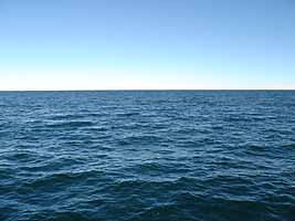 空は、水平線近くは白っぽい水色、空が高くなるにつれて青が濃さを増す。