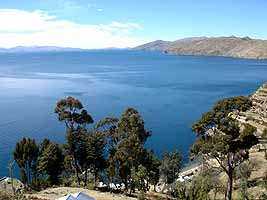 太陽の島の丘の頂から見たティティカカ湖の風景は、素晴らしかった。晴れ上がった空の青と、見渡す限り広がる、さらに濃く鮮やかな湖の青。そして島の緑。標高が高いだけあって空もかなり濃い青なのだが、それとは比べ物にならないほど深い青をたたえる湖。