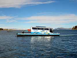 ティティカカ湖峡をボートに乗って渡るバス |