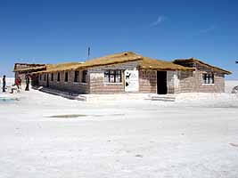 30分くらい走ると、塩湖の真ん中に建物が見えてきた。これは、塩のホテル。建物をはじめ、中のテーブルや椅子、ベッドまですべて塩で出来ている。ここに泊まると夜闇に沈んだ神秘的な塩湖の光景が見られるとのことだ。雪深いスキー場でペンションに泊まった時の、または誰もいないナイタースキーのゲレンデみたいな光景だろうな、と想像してみる。