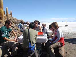 参加メンバーは、もう2年半も世界中を旅しているという32歳のアルゼンチン人、スペイン人の若者、大学の卒業旅行でダブリンから来たアイルランド人のイキのいい若者3人組、そして紅一点のイングランド人の女性。アルゼンチン人は、2年前の日韓ワールドカップの時には日本にいたそうだ。アイルランド人の3人組は、1ヵ月半かけてアルゼンチン、チリを北上してきてボリビアに入ったとい