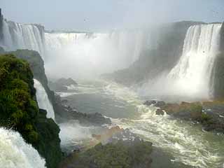 フォス・ド・イグアスの市内から、バスは30分程度でイグアス国立公園の入り口に到着。ここで入場料を支払い国立公園内に入り、ここからはポップな2階建てバスが滝鑑賞遊歩道スタート地点まで観光客を運んでいく。キンキンに冷房の効いたバスは、いくつかの停留所に止まる。そこはトレッキング道の入り口だったりボートツアー催行会社のオフィスだったりする。ちなみに車内のアナウンスは、ポルトガル語、英語、スペイン語の順である。いくつか目かの停留所で降りると、目の前に滝鑑賞遊歩道の入り口がある。遊歩道は、そこから河に向かって一貫して降りていく。始めは滝は遠方にその雄大な姿を現すのだが、その後遊歩道が進むにつれその姿は徐々に大きくなってくる。そして遊歩道最後の部分がハイライトで、「悪魔ののどぶえ」(注)と呼ばれる一番突き当たり、V字の頂点部に形成されている最大級の滝を間近・真横から見ることになる。ここでは滝の水しぶきで常に横殴りの霧雨が降っているようであり、優雅な人々は横の売店で売っているポンチョを着込んでこのクライマックスに突入する。写真やビデオを撮っていてもすぐにレンズが濡れてしまうほどの”雨”である。そして、水煙と共に、常に虹がかかっている。もうもうと上がる水しぶきの中を、無数の鳥が飛び交っている。