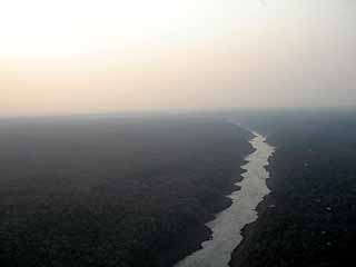 夕暮れのジャングル上空を飛ぶ |