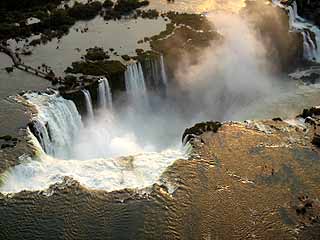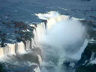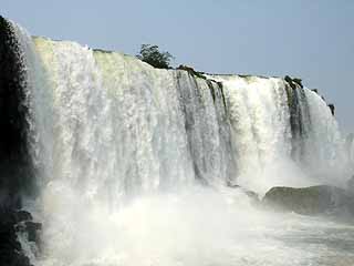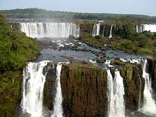 朝7時に起き、ホテルで朝食を食べた後、バスでイグアスの滝へ。イグアスの滝は、ブラジルとアルゼンチンとの国境を流れるイグアス河に忽然と出現する大瀑布である。そこまでは平坦で穏やかな広々としたイグアス河が、突如垂直に切り立った崖に遭遇し、水量豊富な水は奈落の底に向って水煙を四方に発散させながら落ちていく。約4km、落差80mの間に大小約300の滝が存在する、自然の驚異、一大スペクタクルである。上空から見ると、川幅の広いイグアス河の真ん中に、巨大で深遠な陥没があり、その部分が滝となっているのがよく分かる。垂直の落ち込みはV字型に展開し、そのV字部分に滝が何百も存在し、つまり水は何百にも分かれて垂直の壁を落ちる。さらに、この滝の特徴は、二段になっていることである。水は、一段目を落ちた後再び束の間の平坦・水平部を通過し、次に第2段の垂直自由落下に突入していく。