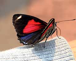 ここイグアスの滝一帯に広がるジャングルは、動植物・昆虫の宝庫であり、とりわけ蝶は500種が生息するといわれる。確かに、歩いているだけで様々な種類の蝶が飛び交っているのに気づく。小型、大型、白、黄色、黒、複雑な模様。そのうち数が一番多いと思われる、黒地に赤、青、薄黄色のサイケな模様を描いた小型の蝶は、これまた人を恐れない無心さの持ち主である。彼らは人の身体に平気で降り立ち、そこで羽を開いたり閉じたりしながら、なかなか飛び立とうとしないのである。普通に人が動いていてもお構いなし。ハエを追い払うように積極的排除に出なければずっと留まり続けている。コイツラは上記二者のように人に害をもたらすわけではないので微笑ましいものだが、それでも蝶がこんなに人間に接近して無警戒というのはあまりない経験なので(トンボならいくらでもあるけれど)、その無邪気さが印象的だった。