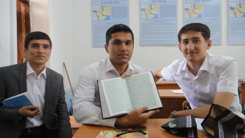 クカルダシュ・メドレセの学生たち。開いている本はコーラン。