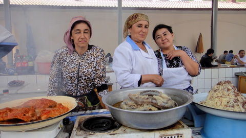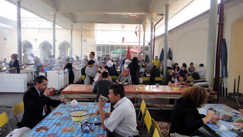 午後1時半、バザールの食堂でプロフを食す。プロフとは、中央アジア風炊き込みご飯。羊肉、人参、玉ねぎ、くるみ、レーズンなどが混ぜられている。美味い!日本人の口に合う。中央アジアの主食、ナンも歯ごたえあり。茶とあわせて8000スム。3ドルくらい。屋台にしてはちょっと高い気がするが美味いので満足。