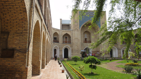 バザールを後にし、近くの神学校、クカルダシュ・メドレセへ。16世紀に建てられた神学校で、ソ連時代には倉庫などとして使われていたが、独立後は再び神学校として活動している。いわゆるイスラム的な建物である。モスクのようでもある。中庭に入ると、中庭に面して教室が並んでいる。人懐っこくまた礼儀をわきまえた学生達が、僕を教室に迎え入れてくれた。コーランを開いて写真を撮る。また彼らは僕に宗教帽をかぶせ、記念撮影する。