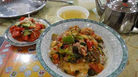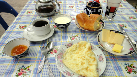 午後6時半、B&Bに戻りしばし休憩。8時前に夕食を食べに外に出る。大通りにある高級目のイタリアンレストランの横に、大衆食堂的レストラン「Zamin」。ここに入る。当たりだ。地元の人たちがたくさん来ていて、ウズベク料理を味わえた。ご飯の上に野菜、羊肉のあんが乗ったご飯もの(通常はスープ入りだったが、スープなしでも出来るとのことで、スープなしにしてもらった)に、ビタミン補給用のトマト+キュウリサラダ。これに緑茶でわずか6000スム。つまり2ドル強だ。安い。ウズベキスタンの物価が分かってくる。このような地元民が行くところでこそ、本当の物価が分かる。やはり昼間のバザールのプロフより安いということが納得できない。つまりは昼間は高い金を払ったのだ。バザールの元気なオバちゃんに騙されたのか、それとも本当に高いのか。あういう市場にある食堂というのはたいてい格安でおいしいものが食える、というのが相場なのだけれど、あそこは高かった。オバちゃんたちは陽気で他意はなさそうだったので、あそこは観光客価格なだけかもしれない。