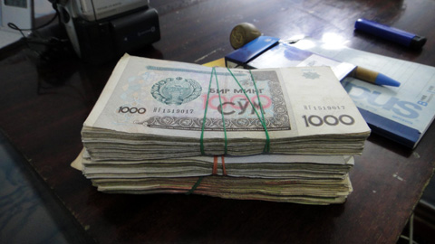 僕はスムを入手しなければならないことを思い出した。奴はこの近づき方からしてどう見ても闇両替屋である。交渉に入る。昨日のB&Bのニーちゃんの話だと、闇のほうがレートがいいのだ。まぁ、それが普通だが。結局1ドル=2800スムで100ドル分換えることにする。スムの一番大きい札は1000スム札なので、1000スム札だと280枚分である。100ドル分のスム札を数えるのが大変だった。僕と両替屋の二人は、近くの屋外喫茶のテーブルに座り、札を数え始めた。サムサかなんかを食べている他の客と相席となる。彼は怪訝な目で札束を数えている僕を見る。1000スム札200枚と500スム札160枚を数える。途中、両替屋は客が残していったサムサの唐辛子ソースを誤ってぶちまけ、僕の『地球の歩き方』を汚しやがった。「すまん、すまん」てな感じで謝ってくる。ったく、頼むよ、これは俺にとって大事な本なんだよ。それとも数えている俺の集中力を散漫にさせてごまかそうってか?そうはいかねぇ。ま、よく奴らを見てみると、ちっともそんな感じはなく、本当に偶然にこぼしてしまったらしいので僕はそれほどムカつきもしなかった。