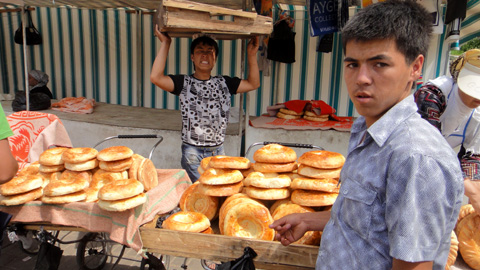 空は晴れ上がった。バザールに戻ると、道でナンが売られている。中央アジアの主食はナンだ。どんな食事にもついてくる。ここのナンはインドのように平たくて楕円形ではなく、丸くて分厚く、中心部がへこんでいる。