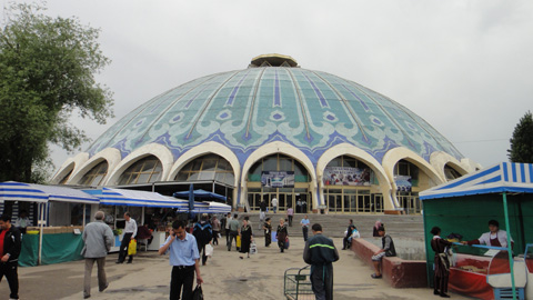 大通りを歩くとすぐにチョルスーバザールという大きな市場だ。その広いこと。中心にあるサーカスのような青いドーム状の建物には、香辛料、米、ナッツなどがメインに並んでいる。外には野菜や果物の屋台風の売り場が連なる。カリフラワーが超巨大。卵売り場には長蛇の列が出来ていて、ウズベクのオバちゃんたちが並んでいる。民族衣装を着ているオバちゃんもちらほら。