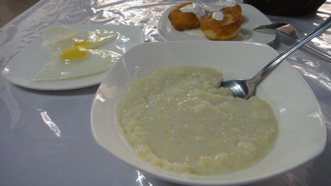 朝8時過ぎに起き、ホテル1階のレストランで朝食。中央アジアのホテルは、基本、朝食付きだ。揚げパン、目玉焼き、お粥のようなもの、茶。このお粥チックなものはこちらに来て初めて食べた。一見するとヨーグルトに見える、クリーミーなお粥。味はほとんどないので、何か調味料をかけて食うのだろうか。これはカザフ料理か。中国の影響を受けた結果だろうか。この街を歩く人も、東アジア系の顔立ちが多い。