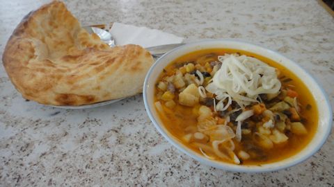 昼飯はバザール内の食堂。プロフはないというので、仕方なくラグマン(中央アジアのうどん)。なかなか美味い。ここの人々はタシケントに比べればおとなしめだ。タシケントでは結構みんなが人懐っこくて、向こうから話し掛けてきたが、ここでは今のところそんなことはない。街なかでもウズベキスタンでは圧倒的に声をかけられる頻度が高い。思い出したが、昨日シムケントでバックパックを背負ってホテルを目指して歩いているときに、なんと僕は女性に道を聞かれた。カザフ語だかロシア語だかで話しかけられたが全く分からないので、「分かりません。僕は旅行者です。」と日本語で答える。おいおい、どう見ても僕はジモティーに見えないでしょ?このバックパックが見えますか?旅行者ですよ旅行者。だが、裏返すと、僕のような顔立ちをした人間が、この街には多いということだ。僕がここに住んでいる人間に見えたんだろう。それともただ単にとても急いでいて、誰彼構わず聞いていたのか。