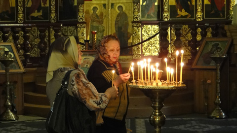 戦士たちの様子を彫ったモニュメントから、鬼気迫る迫力を感じる。公園敷地内にあるロシア正教のゼンコフ教会内では、ろうそくに火を灯して祈る人々。