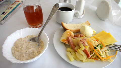 朝食は1階のカフェでバイキング。ただし有料(500デンゲ)。バイキングで500デンゲ(3ドル強)なら安い。例のカザフ式おかゆがよい。シムケントで食べたものに比べ、少し甘い。飲み物はアプリコットジュースとコーヒー。