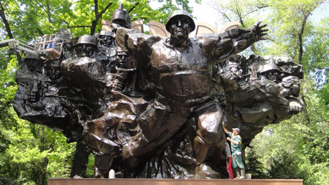 28人のパンフィロフ戦士公園へ。すごい人出。なにやらイベントらしい。そうか、明日は戦勝記念日(休日)なので、今日は前日イベントなのだろう。ここは第2次世界大戦での対ドイツ戦で、モスクワ防御のためにカザフ社会主義共和国から出征し、戦死したパンフィロフ将軍率いる28人の戦士を記念している。
