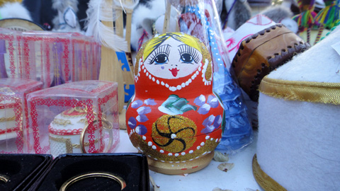 お土産屋を探すがなかなか見つからない。で疲れ切ったところで入ったショッピングセンターに、カザフスタングッズを売る小さな土産物屋があった。安くてかさばらず、会社の人々にたくさん買えるもの・・・、ついにカザフ人形型ボールペンを見つけた。これならカザフ色がある。1本400デンゲを10%まけさせて、360デンゲで16本購入。これでやっと気が重かった義務をクリアし、心も軽くなる。お土産買うのは毎回かなり苦労する。食べ物・飲み物以外では、人にあげるお土産は、実用的なものでないと厳しい。価値観は人それぞれなので、民芸品の置物なんかは、好き嫌いが分かれてしまう。もらった瞬間に机の中にしまわれて一生日の目を見ないようなお土産は、もらう方もかわいそうだ。