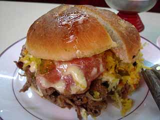 チュラスコ・コンプレートは2700ペソ(4.5ドル程度)とやや高いが、そのボリュームは、単なるハンバーガーと軽視できない(写真参照)。最近、「日本のハンバーガーよ。遊びはもう終わりだ。」というキャッチで、マクドナルドがクウォーターパウンダーなるバーガーを発売したが、あんなものどころではない。あまりに大きく、挟まれている物もあふれんばかりなので、手で持って口を大きく開けて食べられる代物ではない。これはもう、ハンバーガーというか、料理なのだ。ナイフとフォークで食べたが、当然のようにバーガーは崩れ行き、とても食べにくかった。が美味かった。